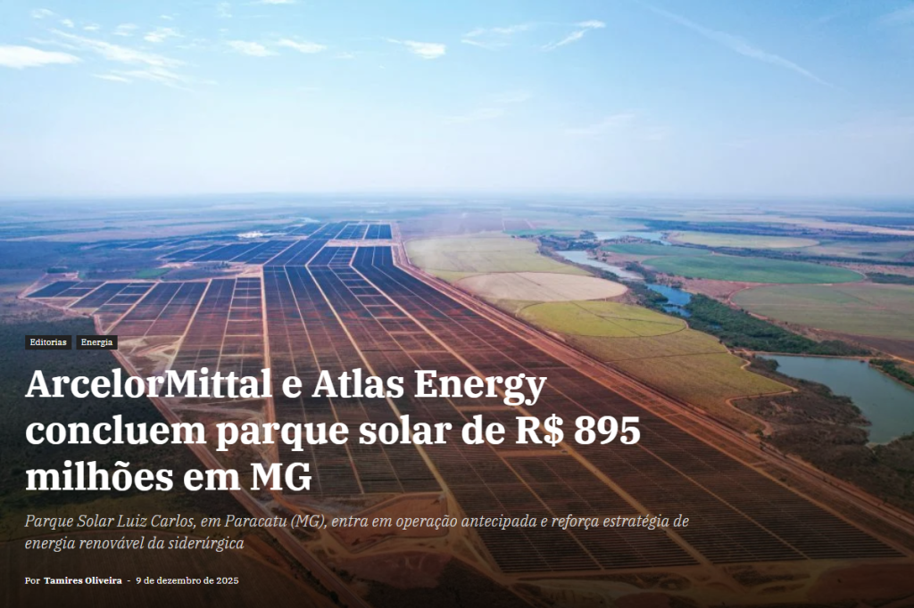 A ArcelorMittal e a Atlas Renewable Energy concluíram, 90 dias antes do previsto, a implantação do lado B do Parque Solar Luiz Carlos, em Paracatu, no noroeste mineiro. Esta é a primeira usina solar da ArcelorMittal no Brasil, com 315 MWp de capacidade instalada e geração estimada de 74 MW médios por ano. A partir de dezembro de 2025, o empreendimento passa a ser integralmente controlado pela ArcelorMittal Brasil.